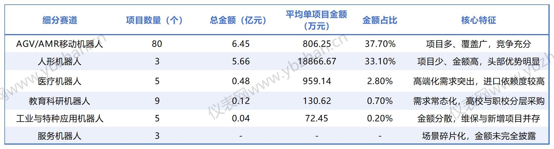 補充賽道整體呈現“需求精準化、場景碎片化、發展差異化”的特征。醫療機器人雖項目數量僅5個,但平均單項目金額達959.14萬元,僅次于人形機器人,凸顯高端手術裝備升級的剛性需求,不過2.8%的金額占比也反映出其尚未形成規?;少彂B勢;工業與特種應用機器人項目數量5個、總金額僅0.04億元,平均單項目金額72.45萬元,金額占比不足1%,呈現出項目分散、以維保和小型新增項目為主的特點;服務機器人則因場景碎片化導致項目金額未完全披露,3個項目的規模也反映出其尚未進入政府采購的規?;瘧秒A段。